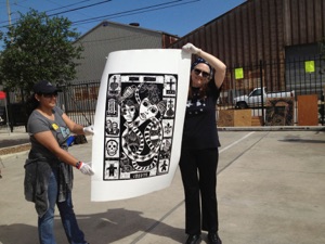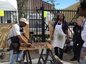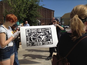 Lenard Brown Inking Peck’s woodcut while Vet and Peck watch.